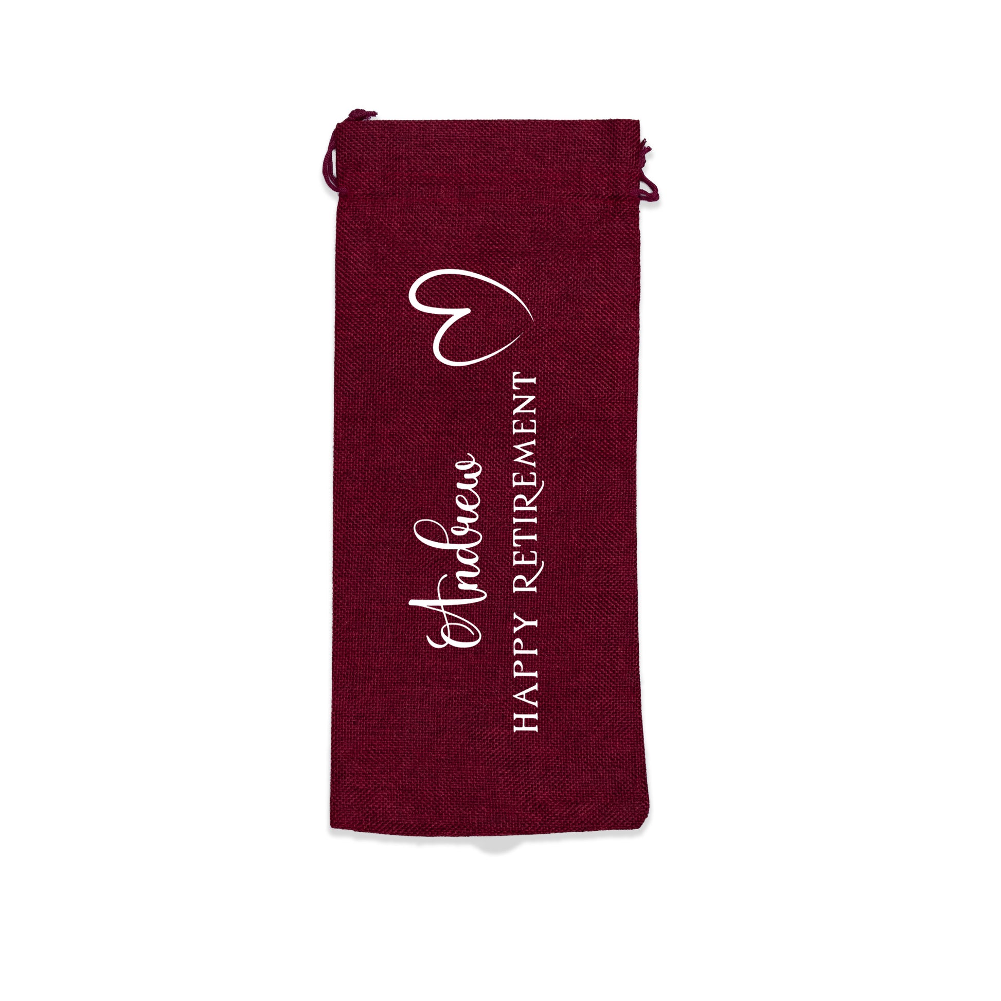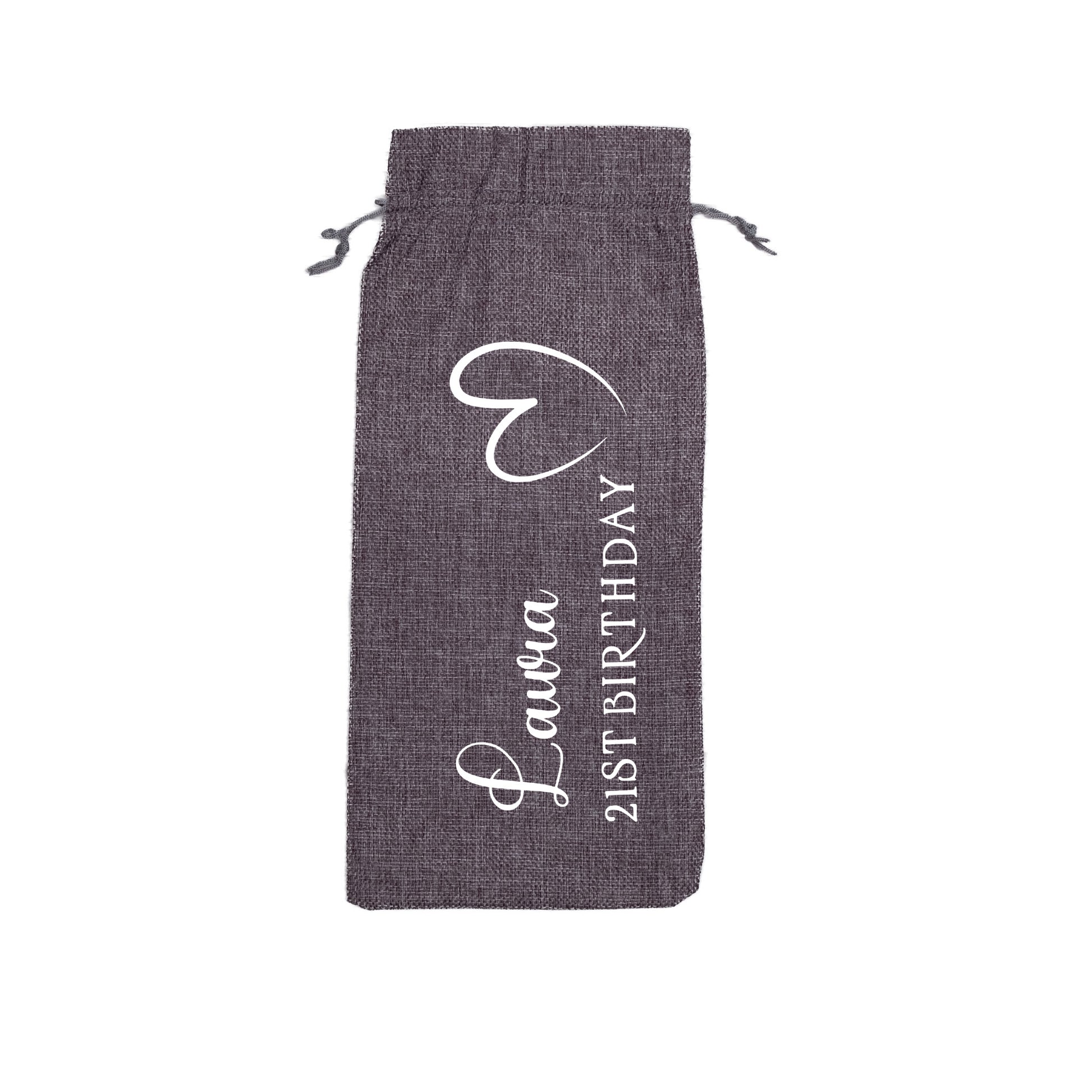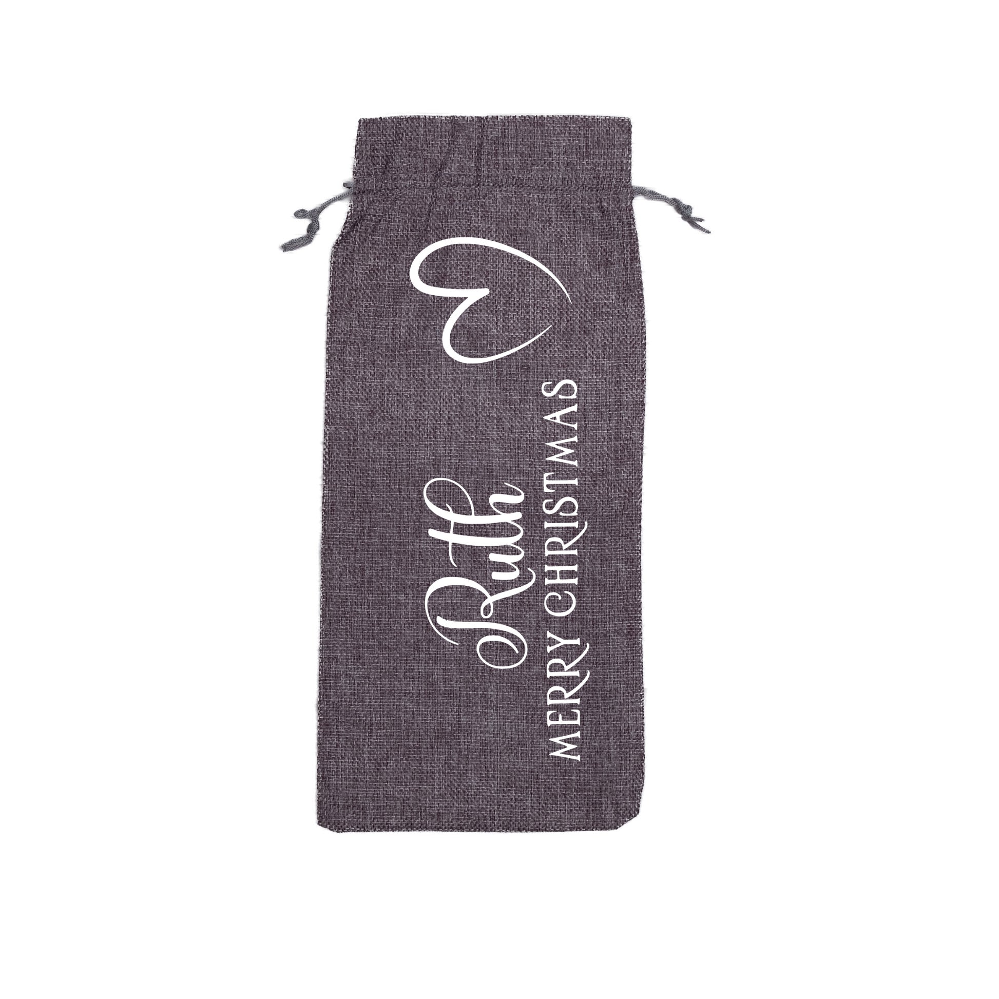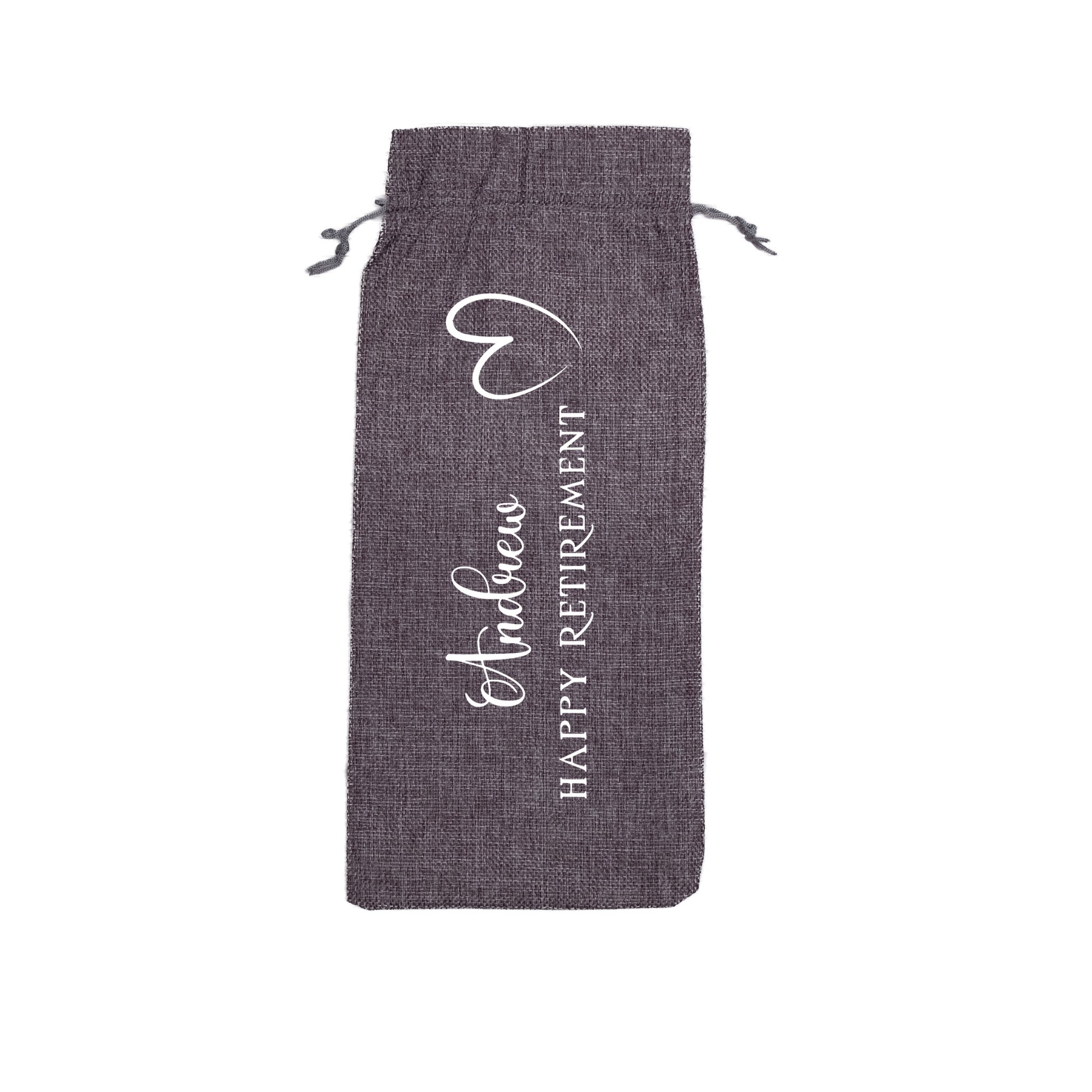 PERSONALISED BURLAP/HESSIAN STYLE WINE BOTTLE GIFT BAG in a variety of fashionable colours customised in our craft workshop to your specifications. All personalisations are included and there is free economy (2nd class) shipping on everything. Please note down all personalisation information into the comment field below. Also please note which product you are purchasing so we can tie your form up to the right order.