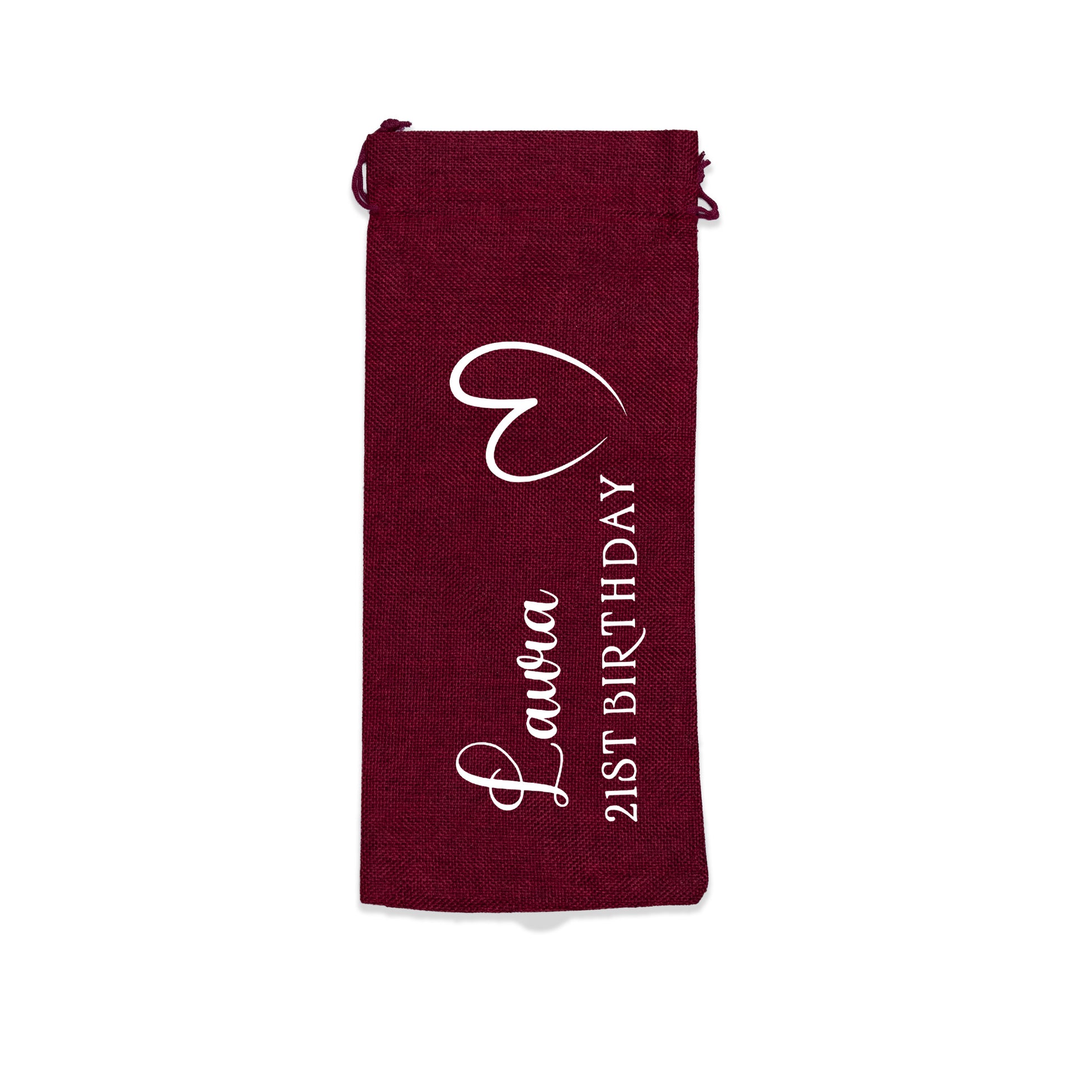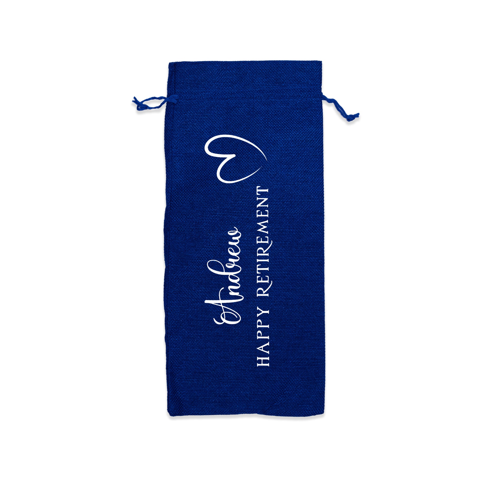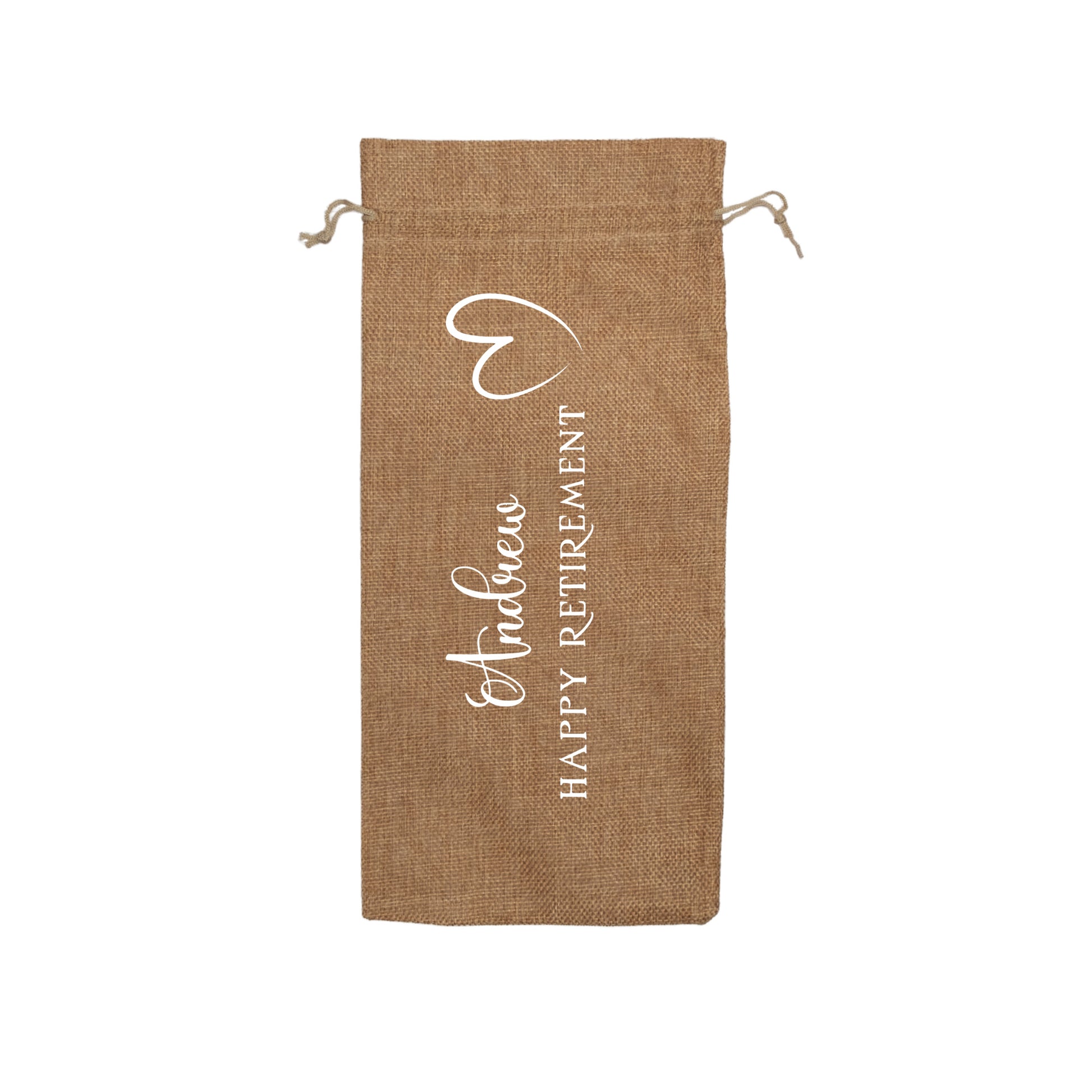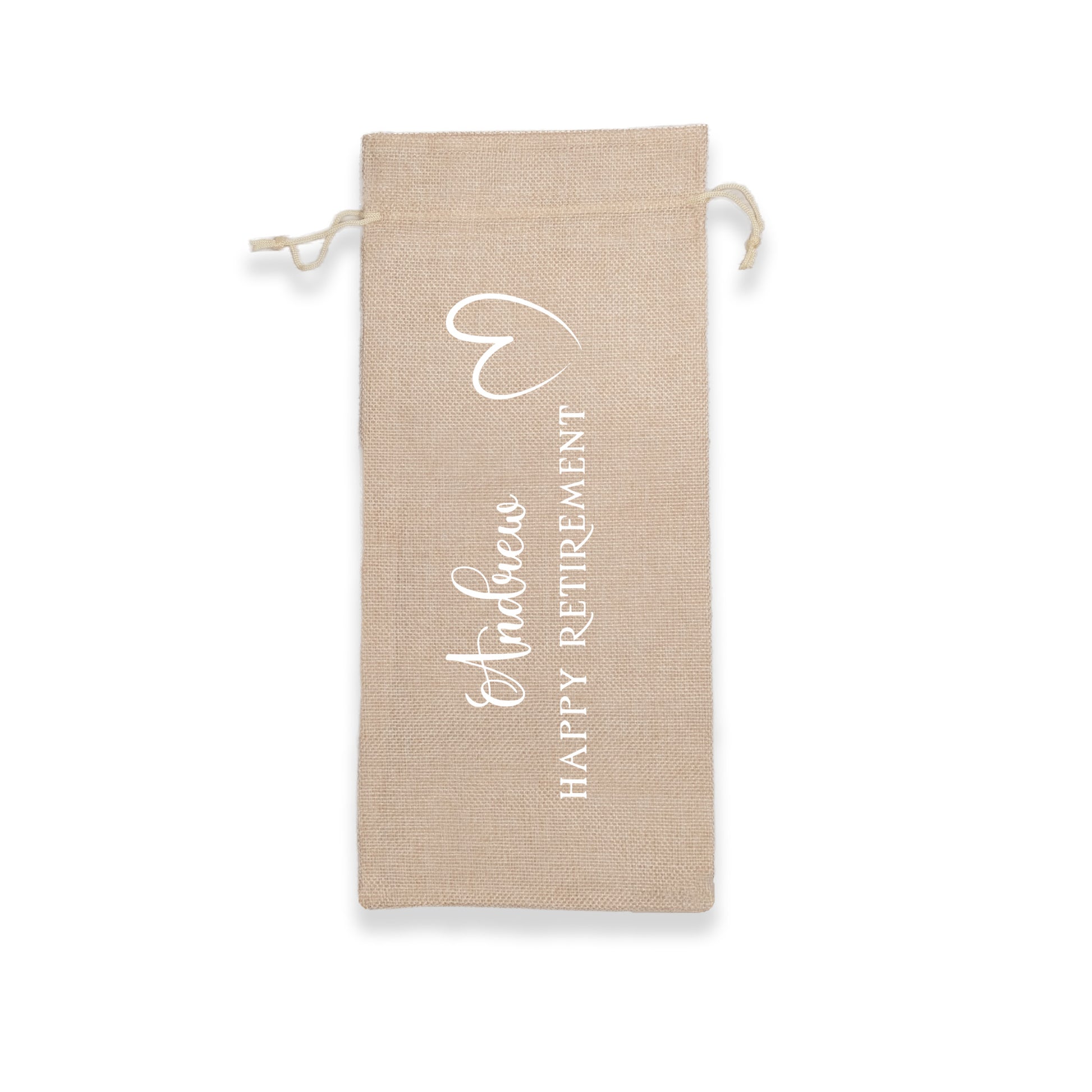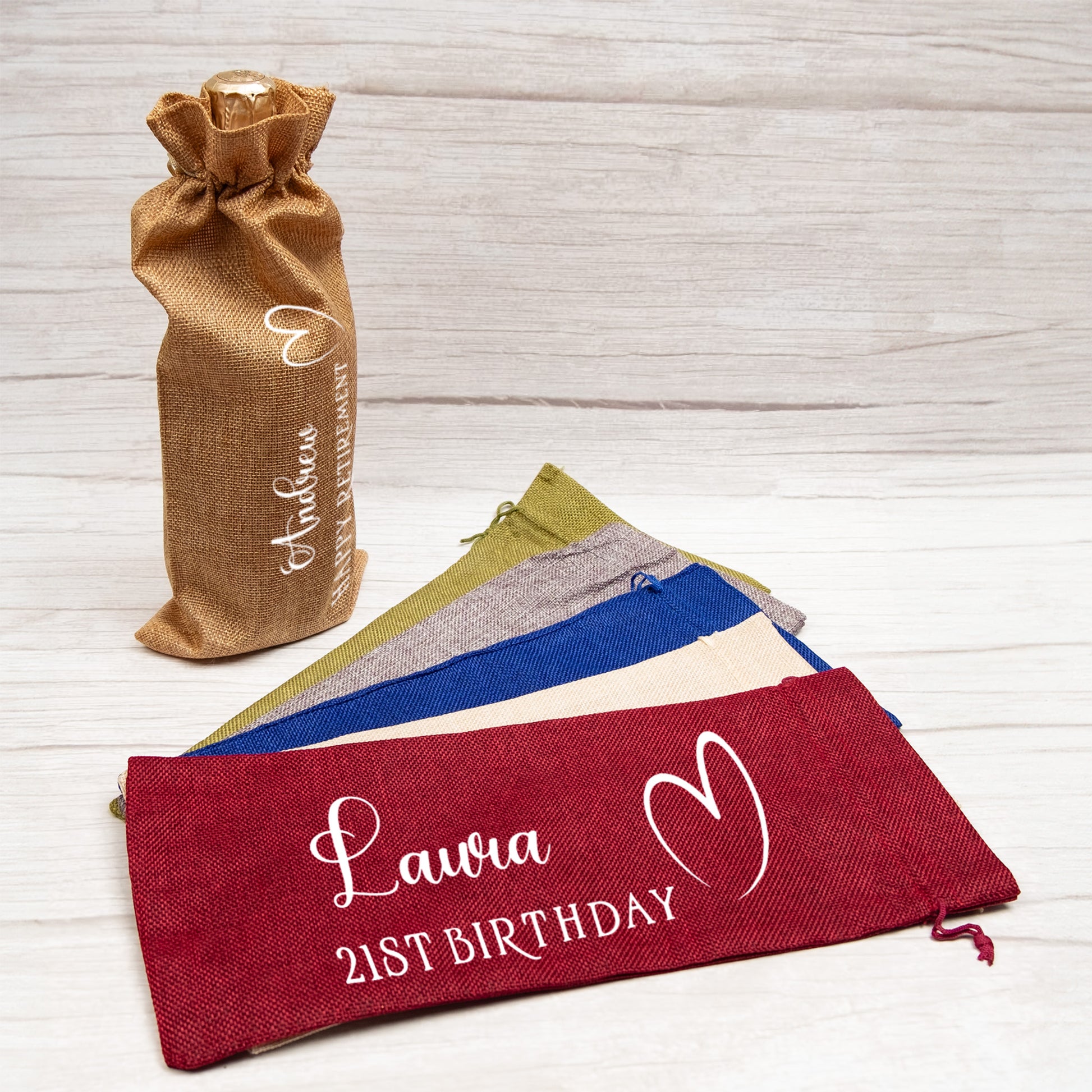 PERSONALISED BURLAP/HESSIAN STYLE WINE BOTTLE GIFT BAG in a variety of fashionable colours customised in our craft workshop to your specifications. All personalisations are included and there is free economy (2nd class) shipping on everything. Please note down all personalisation information into the comment field below. Also please note which product you are purchasing so we can tie your form up to the right order.